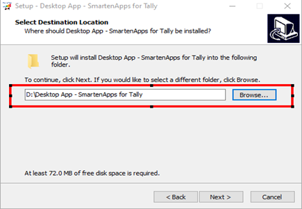 .Note: The system drive requires user permissions. To avoid this permission issue, install SmartenApps for Tally – Desktop Utility on a non-system drive (e.g., **D:, F:**, etc.), and then press the ‘Next’ button.