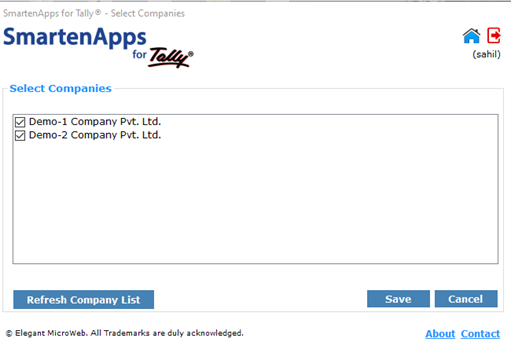 - Step 8: Click on Select Companies. The system will list the companies configured within your Tally installation. Choose companies for extraction. Then press the Save button